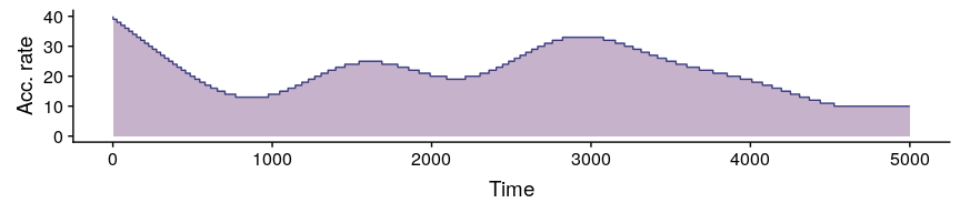 4. Generate a virtual accumulation rate. Note that virtual accumulation rates generated by the function simulateAccumulationRate are not intended to be realistic (similar to existing accumulation rate curves), but to provide the means to distort the pollen data in similar ways as real accumulation rate curves do. Still, the users can use their own accumulation rates, as long as they have the same estructure as the output of simulateAccumulationRate.
