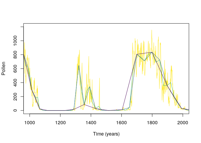 6. Optional: re-interpolate the data into a regular time grid. Comparing the different pollen curves through methods such as regression requires them to be in the same temporal grid (a.k.a, have the same number of cases). The function toRegularTime handles that seamlessly.
