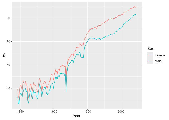 #> # ℹ 1 more variable: ax <dbl>Life expectancy (\(e_x\) with \(x=0\) by default) is computed using
