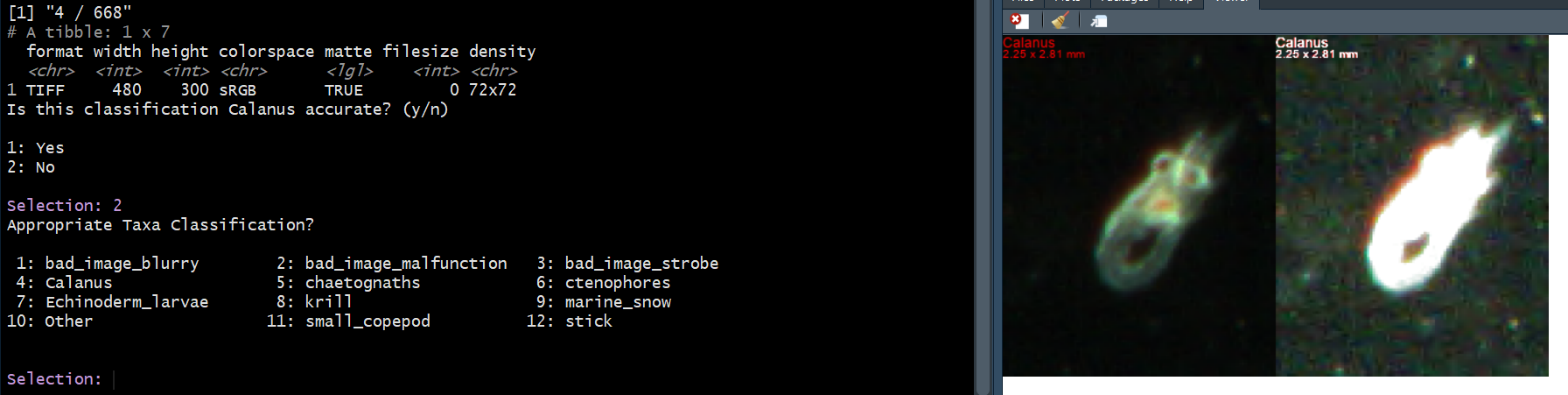 Figure 2. A screenshot from the vprr manual reclassification process. VPR images are displayed in the RStudio Viewer (right), prompts are displayed in the RStudio console (left). Users are asked if classifications are correct, if not, they are asked to select the proper classification from a pre-set list of categories.