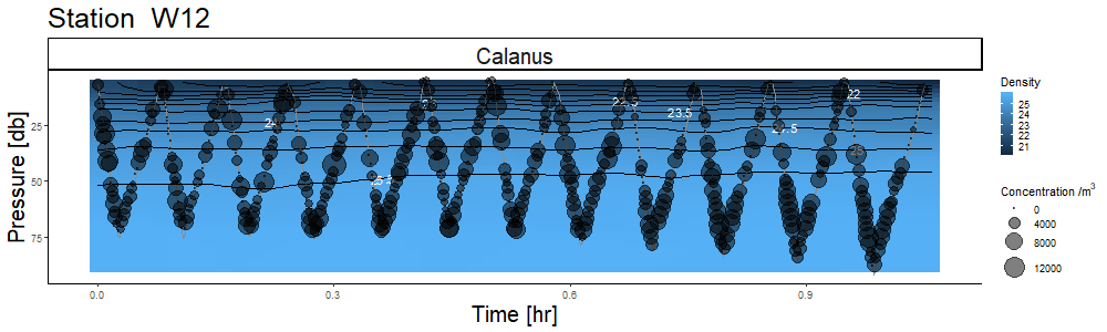 Figure 3. An example of visualization of VPR data showing calculated concentration of Calanus along the VPR tow-yo path, over density contours.