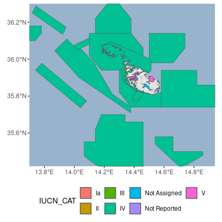 geom_sf(aes(fill = IUCN_CAT), data = mlt_pa_data, inherit.aes = FALSE) +