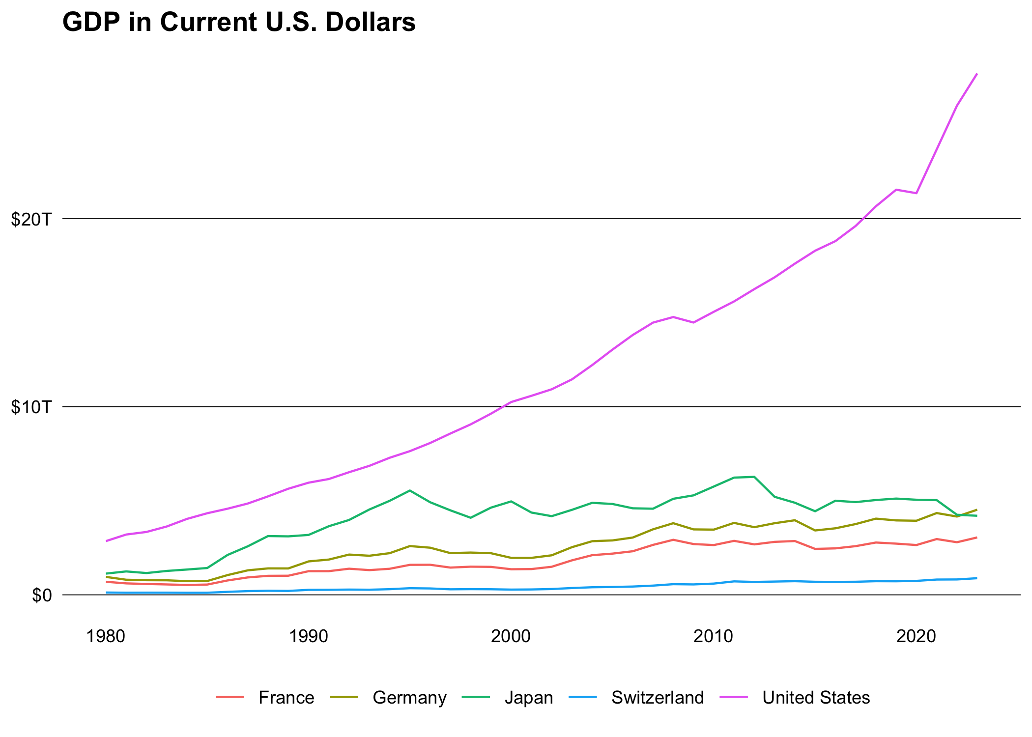 gdp <- wb_data("NY.GDP.MKTP.CD", c("US", "DE", "FR", "CH", "JP"))