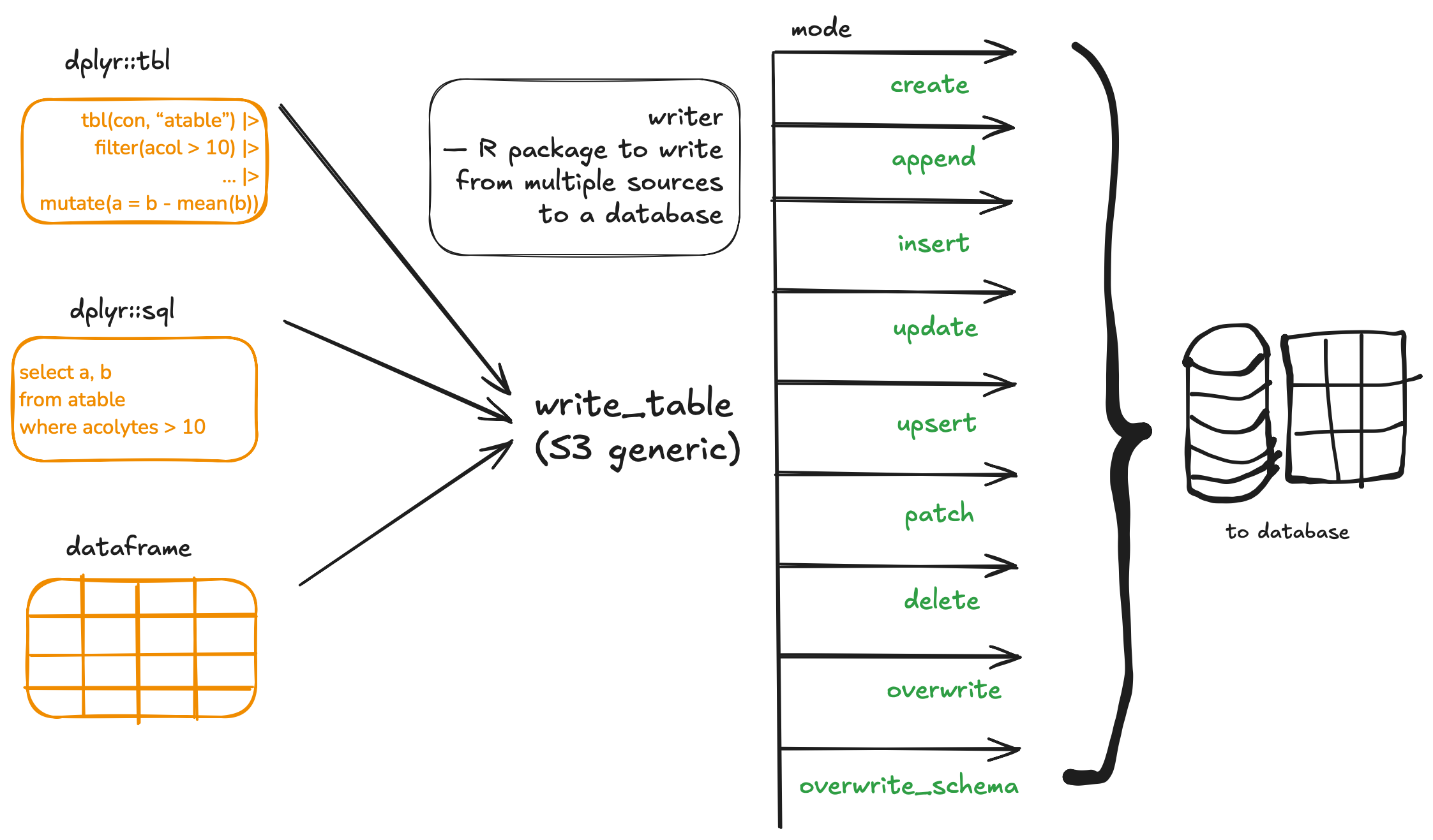 writer package provides unified syntax to write data from lazy dplyr tbl or dplyr sql query or a dataframe to a database table with modes such as create, append, insert, update, upsert, patch, delete, overwrite, overwrite_schema.