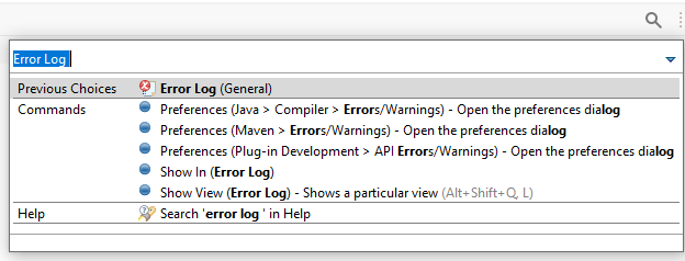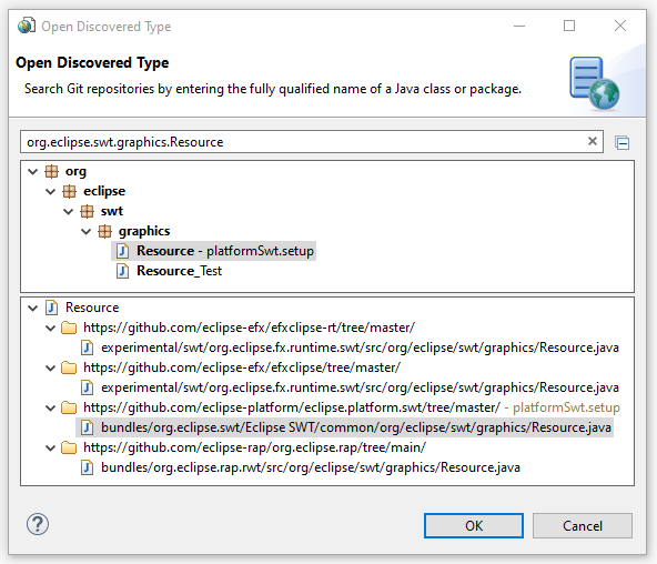 So we know this dialog is provided by org.eclipse.epp.mpc.ui. In addition, we also see the class names which we can use with Navigate → Open Dicovered Type. As such if we have issues with this dialog, we know to open the issue with the Marketplace Client project.